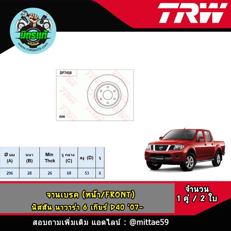 ยี่ห้อ : TRW (ทีอาร์ดับบลิว) สินค้า : ดิสเบรค / จานเบรค